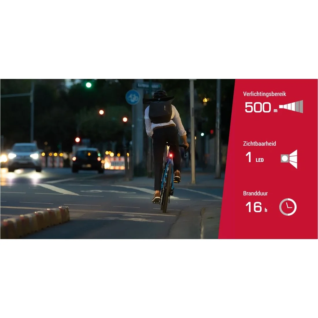 Dankzij de moderne lens kan deze achterlamp parallel aan de zadelpenbuis worden gemonteerd, waardoor hij sportief-elegant en onopvallend in het totaalbeeld van je fiets past. Met een zichtbaarheid vanaf 500 meter ben je goed zichtbaar voor andere weggebruikers, waardoor je veilig kunt fietsen, zelfs in het donker.