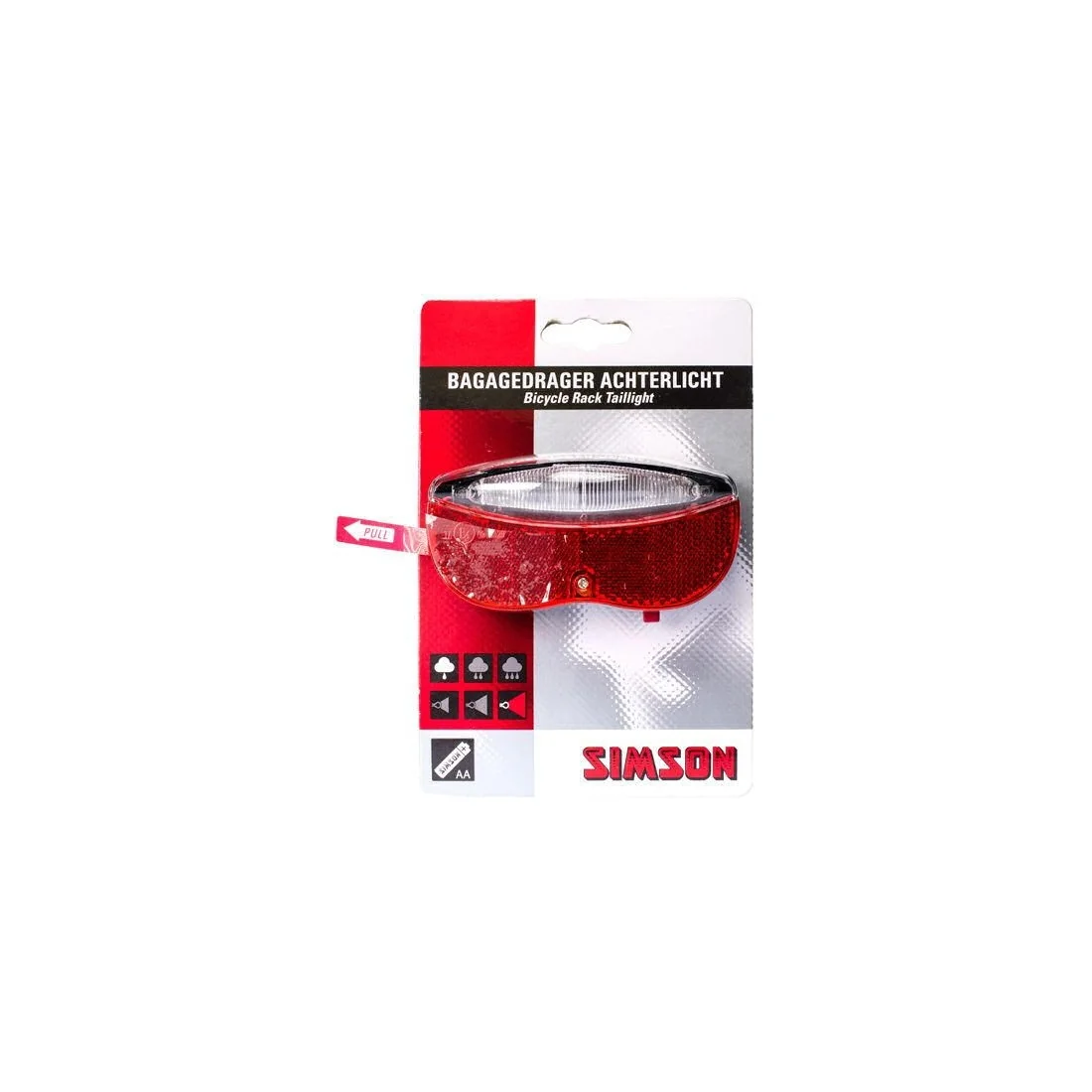 Met het Simson batterij bagagedragerachterlicht Regular ben je altijd goed zichtbaar op de weg. Dit achterlicht heeft een tunnel LED verlichtingssysteem, waardoor je extra goed zichtbaar bent voor andere weggebruikers. Met de aan- en uitschakelaar aan de onderzijde kun je het achterlicht eenvoudig bedienen.