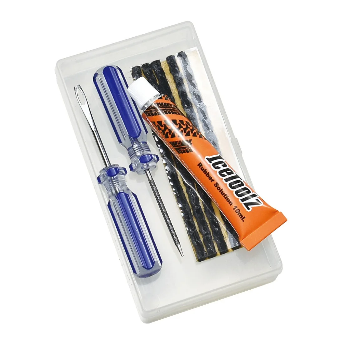 De kit bevat een flesje van 10 ml lijm, waarmee je de bandenplug stevig kunt bevestigen. Met de bijgeleverde bandenplugtool kun je de plug eenvoudig in de lekke band plaatsen, zodat deze weer luchtdicht wordt. De bandenplug heeft een afmeting van 10 x 3,5 cm, wat zorgt voor een goede afdichting van de lekke plek.