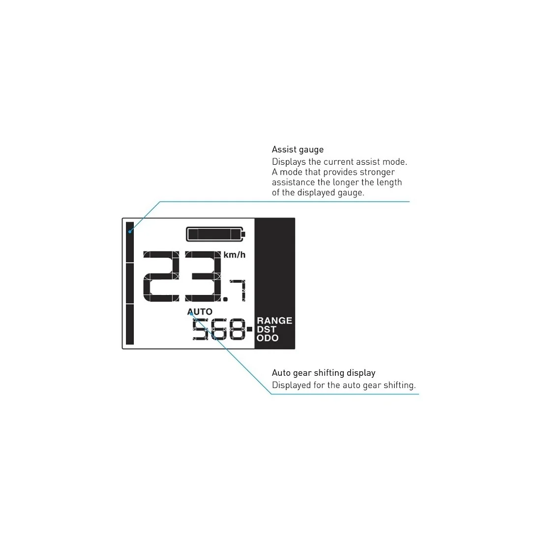 Deze fietscomputer heeft een breed scala aan handige functies. Naast het tonen van essentiële rijgegevens, bevat het ook een klok, batterijlading niveau, ritafstand, rittijd en een kilometerteller. Met de geschatte actieradius kun je altijd precies zien hoe ver je nog kunt rijden. Daarnaast heeft de display een stroomindicator voor de ondersteuning en een foutmelding functie.