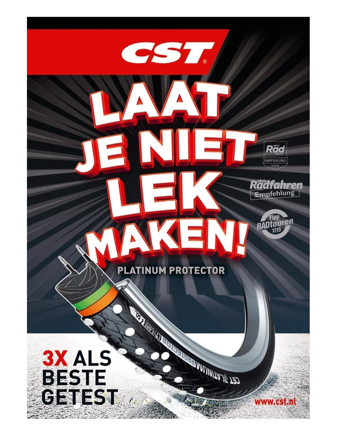 Maak je klaar om de weg op te gaan met vertrouwen en gemoedsrust. Kies voor de CST Platinum Protector buitenband en geniet van de ultieme lekbestendigheid, uitstekende rijeigenschappen en ongeëvenaarde kwaliteit. Waar wacht je nog op.