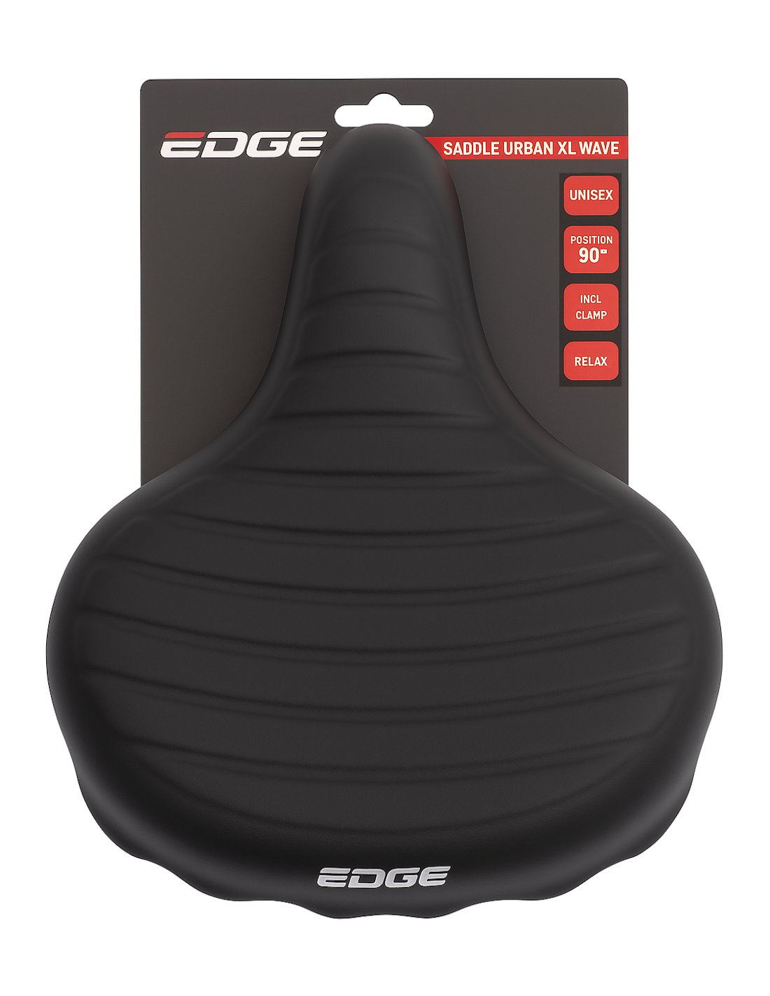 Het Fietszadel Edge Urban XL Wave - Zwart wordt geleverd met een zwarte zadeldek, zwarte rails en zwarte veren. Hierdoor past het zadel perfect bij elke fietsstijl en geeft het een stijlvolle touch aan je tweewieler.
