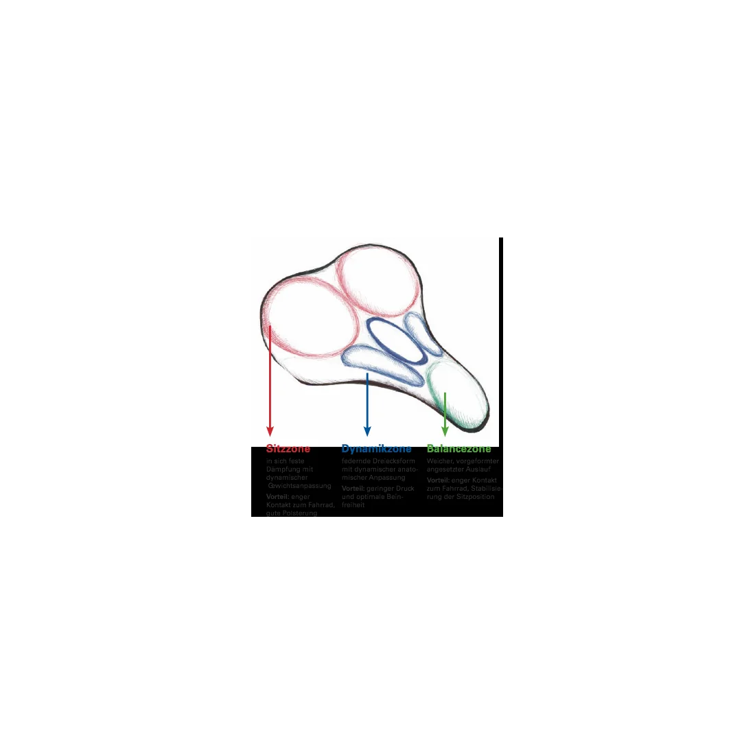 In de midden dynamische zone vindt u een verende driehoeksvorm met dynamische anatomische aanpassing. Dit vermindert de druk op uw zitbotten en zorgt voor optimale beenvrijheid. U zult merken dat u langer comfortabel kunt blijven zitten, zelfs tijdens lange ritten.