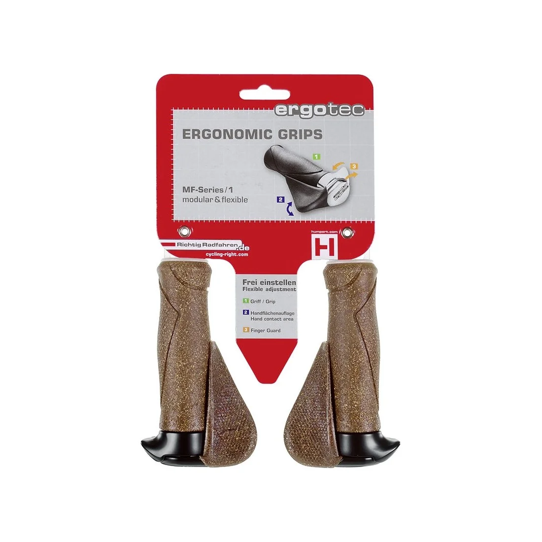 Investeer in uw comfort en prestaties tijdens het fietsen met het Handvatpaar Ergotec MF1 kurk / aluminium 130+130 mm - bruin / zwart.